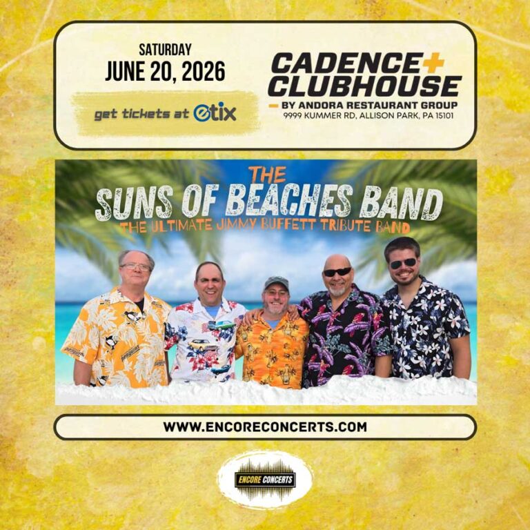 TIMES: Entry Time: 6:00 PM / Show Time: 7:00 PM DESCRIPTION: Cadence Clubhouse and Encore Concerts proudly present The Suns of Beaches Band – The Ultimate Jimmy Buffett Tribute Band – live in concert on Saturday, June 20, 2026. Event entry begins at 6:00 PM and the show starts at 7:00 PM. Advance tickets are…