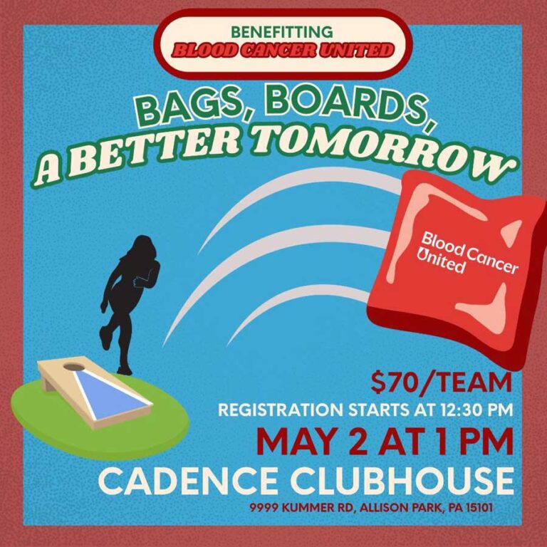 Celebrate for a cause at Cadence on May 2. The day will benefit Blood Cancer United, beginning with the Bags, Boards, Better Tomorrow cornhole tournament outdoors, followed by the Spring Fling Gala indoors from 6:00 PM to 10:00 PM. Gala tickets are required. Additional gala artwork and details will be shared soon.